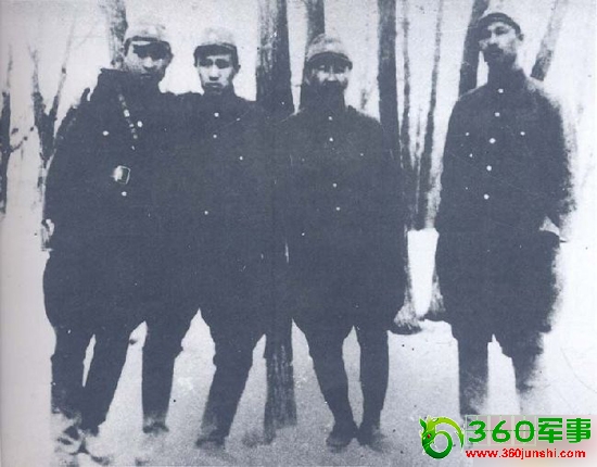 抗联时金日成(左一)、季青(左二)、崔贤(右二)、安吉(右一)在小部队活动时期的合影。