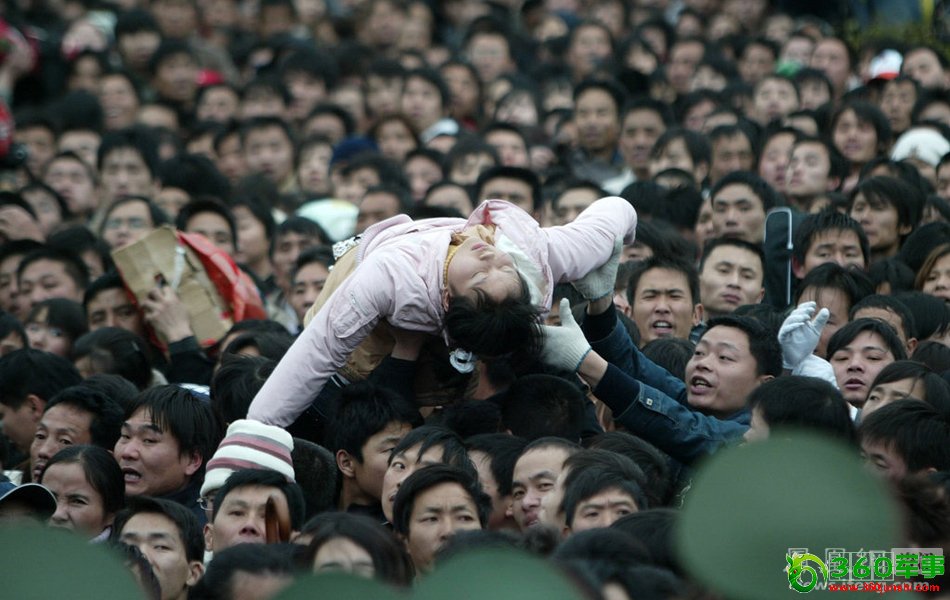2008年春运期间,南方冰灾致使铁路中断,数十万乘客滞留在广州火车站外。图为1月31日,火车站广场外,一名在人群中晕倒的乘客被抬高救出。