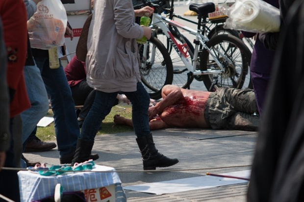 光头男子裸露上半身躺地,腹部可见刀伤。