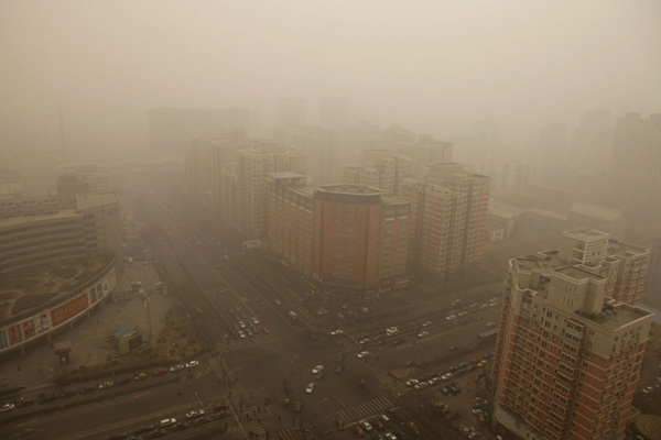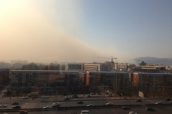 2月27日,北京海淀区西四环中路上空的沙尘。