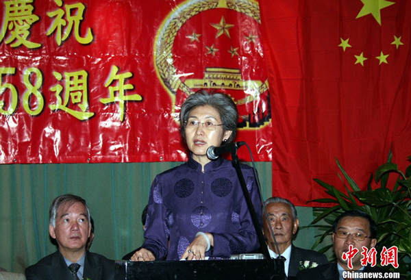 2007年9月17日,全英各界华人华侨在伦敦举行庆典,庆祝中华人民共和国成立58周年。时任中国驻英大使的傅莹在庆典上致辞。