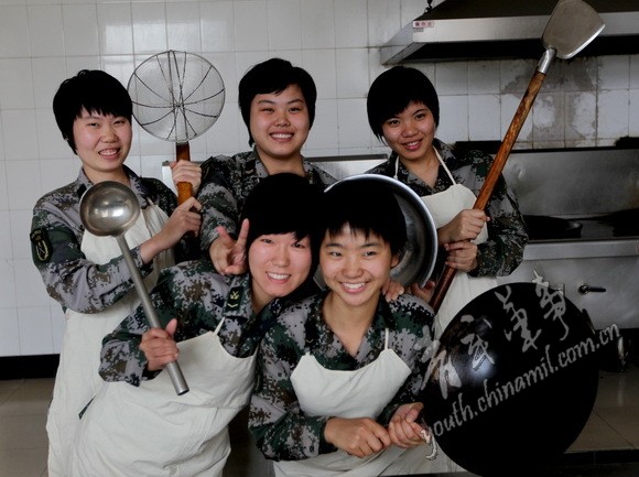 长话连是个女兵连队,炊事班里的五名成员也是清一色的小女兵。别看这些小女兵们看上去文文静静,干起活来丝毫不逊色于男兵。不管是重大节日加餐还是平时就餐,从食材的选购到菜肴的烹制,她们从来不用外援,都是自己动手。就连搬米抬油这样的重活,也是连拖带拽自己搞定。给连队送菜的供应商最怕她们,如果质量差一点、斤两少一点、速度慢一点,女兵们都会找供应商理论。除了当兵五年的司务长李娜外,这些年轻的炊事女兵们全是90后,且个个都是大学生士兵。但她们所在的长话连,在上级组织的比武竞赛中处处勇拔头筹,年年都被上级评为军事训练一级单位、基层建设标兵单位,是一支远近闻名的荣誉连队。