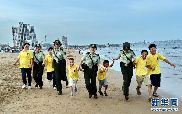 这是秦皇岛市西河南边防派出所女子巡逻队的民警带着北京光爱学校的孩子在南戴河海滨玩耍
