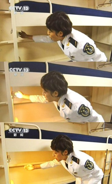女舰员的上下式床铺,请注意在海军舰艇上是不叠“豆腐块”的,这是海军特殊的生活工作环境造成的。下图为贴心的鞋柜,请注意鞋柜里摆放有迷彩制式鞋和白色体能鞋。