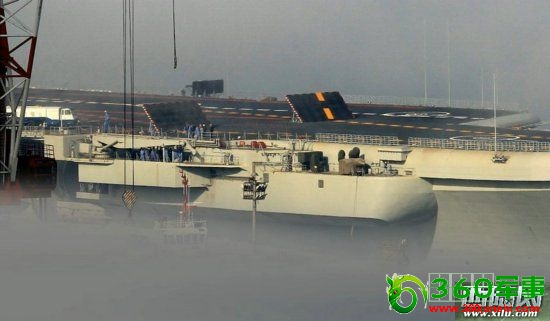 正在缓缓入港的瓦良格航母,其甲板上的两块供舰载机起降使用的挡焰板竖起